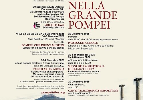Tra improvvisazione contemporanea e vibrazioni senza tempo alla Villa di Poppea a Oplontis il 20 dicembre si esibirà il Vincenzo Saetta Trio, mentre a Villa Regina a Boscoreale il 21 dicembre suonerà il Matteo Franza Jazz Trio e a Pompei il 30 dicembre la Boomerang Jazz, street band che si esibirà per le strade della città antica. Ore 10:30 – 12:30.