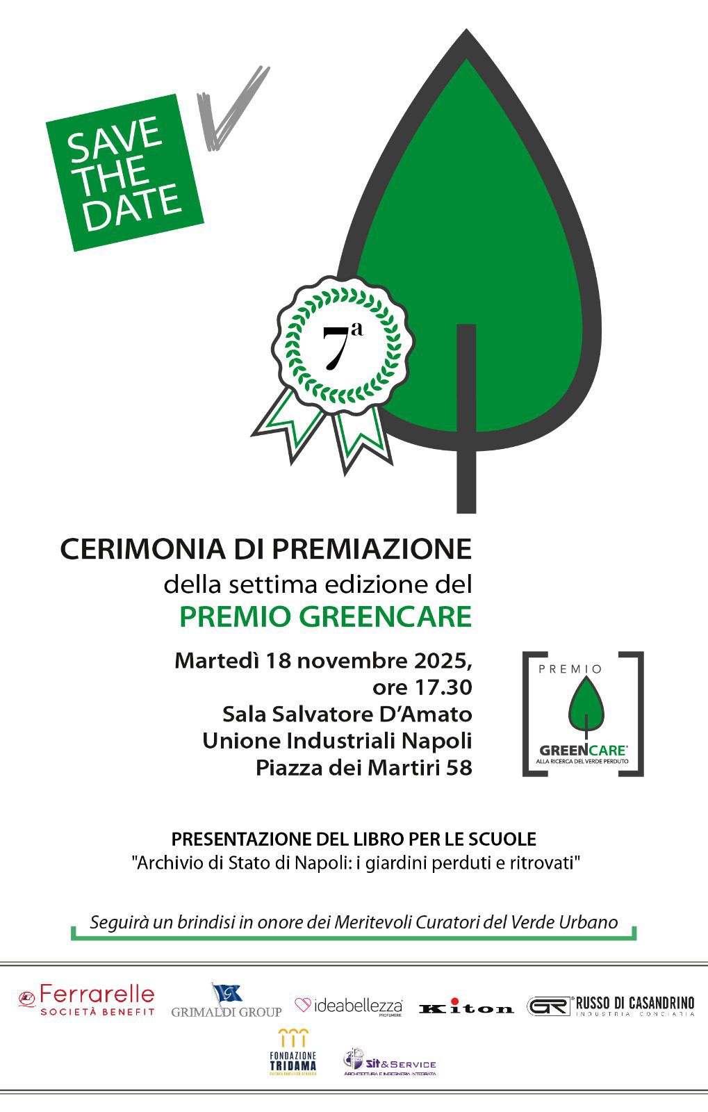 Annunciati i vincitori del Premio GreenCare 2025, che da sette edizioni intende riconoscere il valore di chi è impegnato nella cura, creazione, tutela e valorizzazione delle aree verdi negli spazi urbani, presenze che aumentano la qualità del vivere e il benessere psicofisico dei cittadini. La cerimonia di premiazione è in programma martedì 18 novembre 2025, ore 17.30, presso la Sala Salvatore D'Amato dell’Unione Industriali Napoli (Piazza dei Martiri 58).