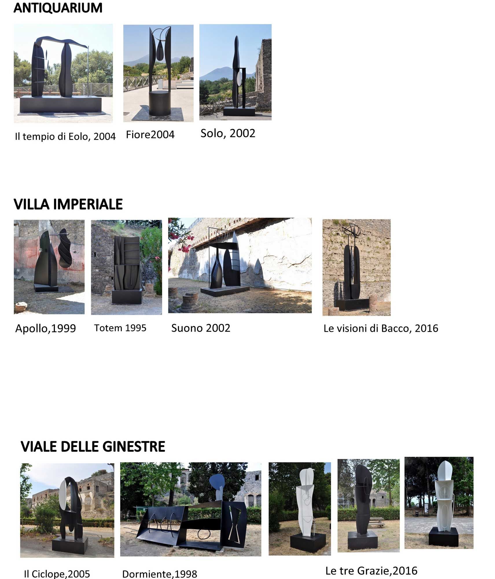 Dodici sculture, in parte realizzate specificamente per questa mostra, collocate sulla terrazza dell’Antiquarium che accoglie Il tempio di Eolo, Fiore e Solo; presso la Villa Imperiale che ospiterà Apollo, Totem e Le Visioni di Bacco e ancora lungo il Viale delle Ginestre con Le tre grazie, trittico realizzato in acciaio dipinto, il Ciclope, il Suono, Il dormiente, quest’ultima già esposta nel 1998 in occasione della grande mostra allestita al Palazzo Reale di Napoli. Le sculture sono segni del silenzioso dialogo con il passato attraverso le quali l’artista esprime l’identità con la terra di origine, con la sua storia, con il valore che essa assume nella contemporaneità.